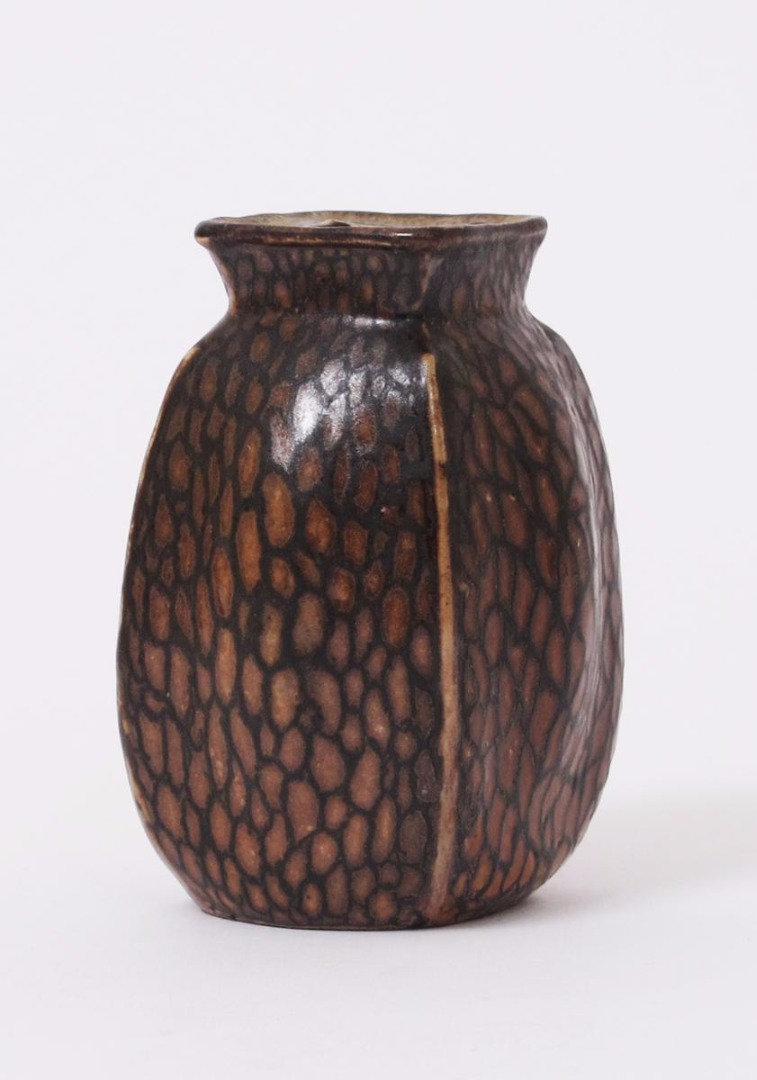 A Martin Brothers stoneware gourd vase by Edwin & Walter Martin, dated 1902, swollen square section, glazed brown with painted burnt umber veins, and incised decoration to top rim, incised 1-1902 Martin Bros London & Southall 8cm. high