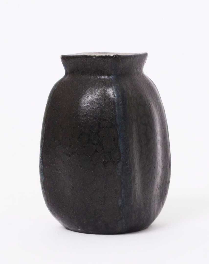 A Martin Brothers stoneware gourd vase by Edwin & Walter Martin, dated 1902, swollen square section, painted dark bronze and brown with green spots incised 1-1902 Martin Bros London & Southall 8.5cm. high