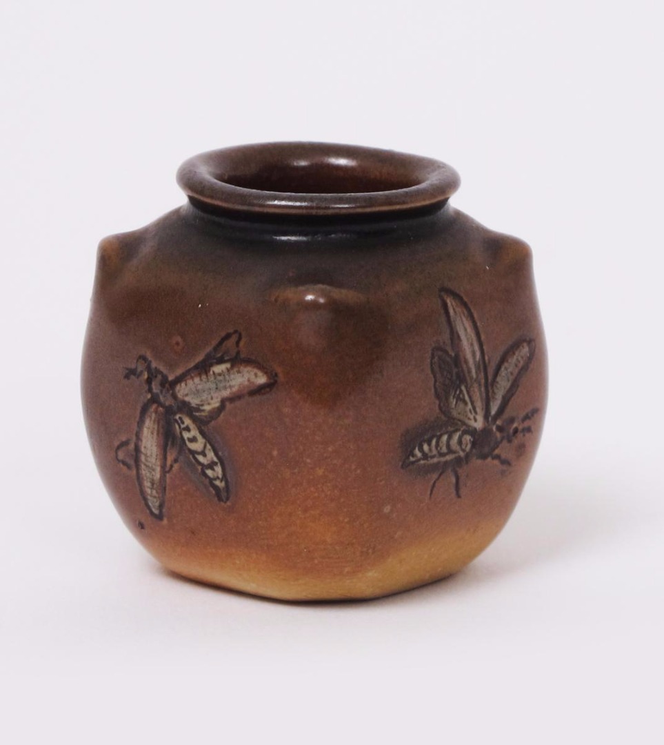 A Martin Brothers miniature stoneware gourd vase by Edwin & Walter Martin, dated 1902, dimpled square section, incised with a wasp to each side, glazed in brown and white on a buff ground incised 1902 Martin Bros London 4cm. high