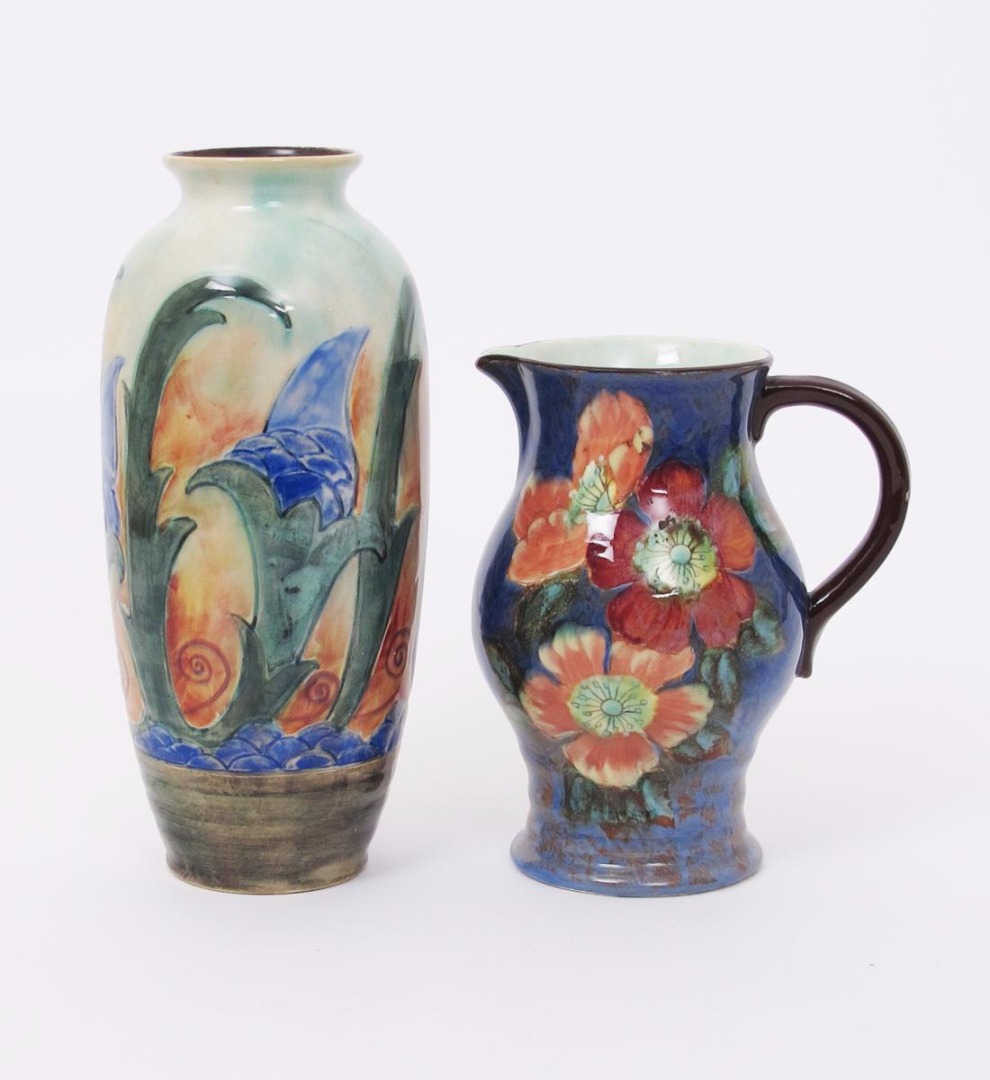 A Royal Doulton Brangwyn Ware vase designed by Sir Frank Brangwyn, shouldered form, decorated in low relief with stylised foliage in green, blue and red over a streaked pale green and blue ground, and a Royal Doulton jug printed factory marks, 30cm. high (2).