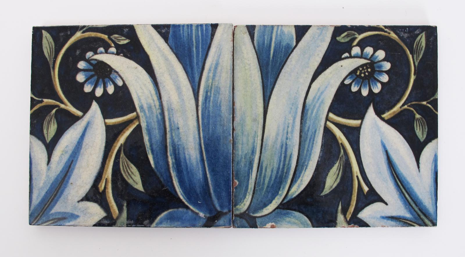 A pair of William De Morgan Memland Hall Poole Architectural tiles, painted with a white lily flower on scrolling foliage in shades of white, green and brown on a deep blue ground impressed marks, minor glaze chips, 15.5cm. square