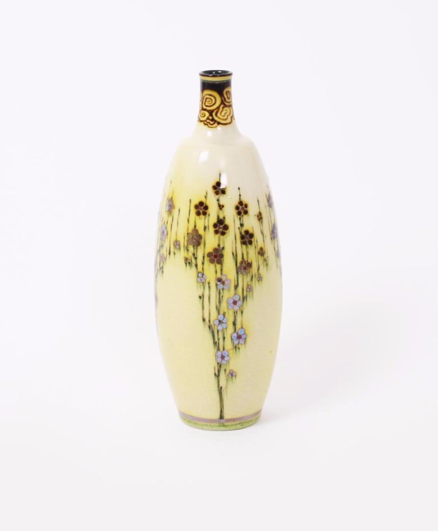 A Pilkington's Lancastrian Pottery vase by Gordon Forsyth, shouldered form with solifleur neck, painted with panels of flowers in ruby and golden lustre on a pale lemon ground impressed mark, painted artist cipher and date code, professional restoration to neck, 23.5cm. high