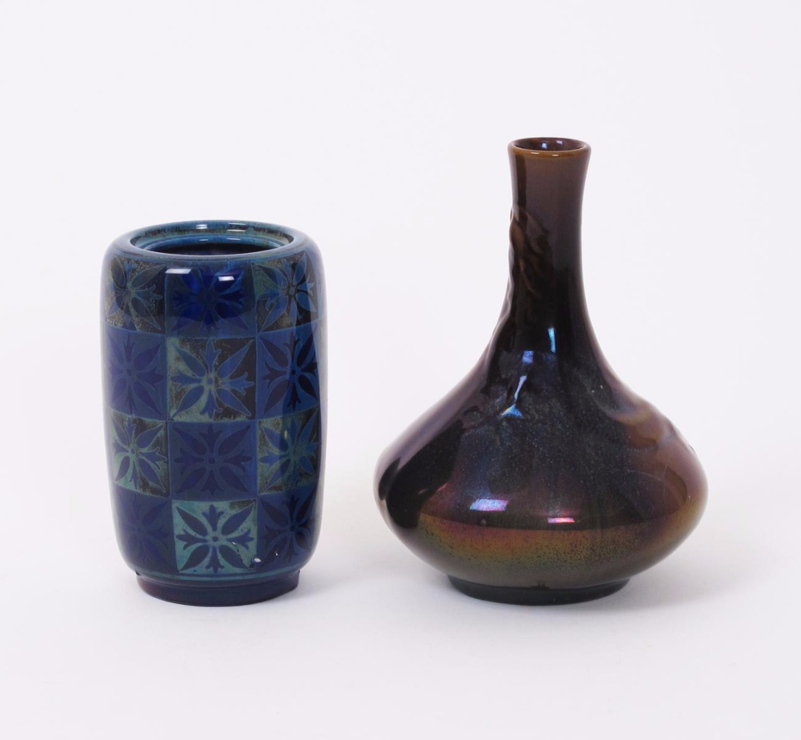 A Pilkington's Royal Lancastrian pot by William S Mycock, shouldered cylindrical form, painted with panels of stylised flowerhead motif in blue lustre, and a lustre vase moulded in low relief with a dragon, glazed brown lustre impressed marks, painted cipher, main vase missing cover 13cm. high (2)
