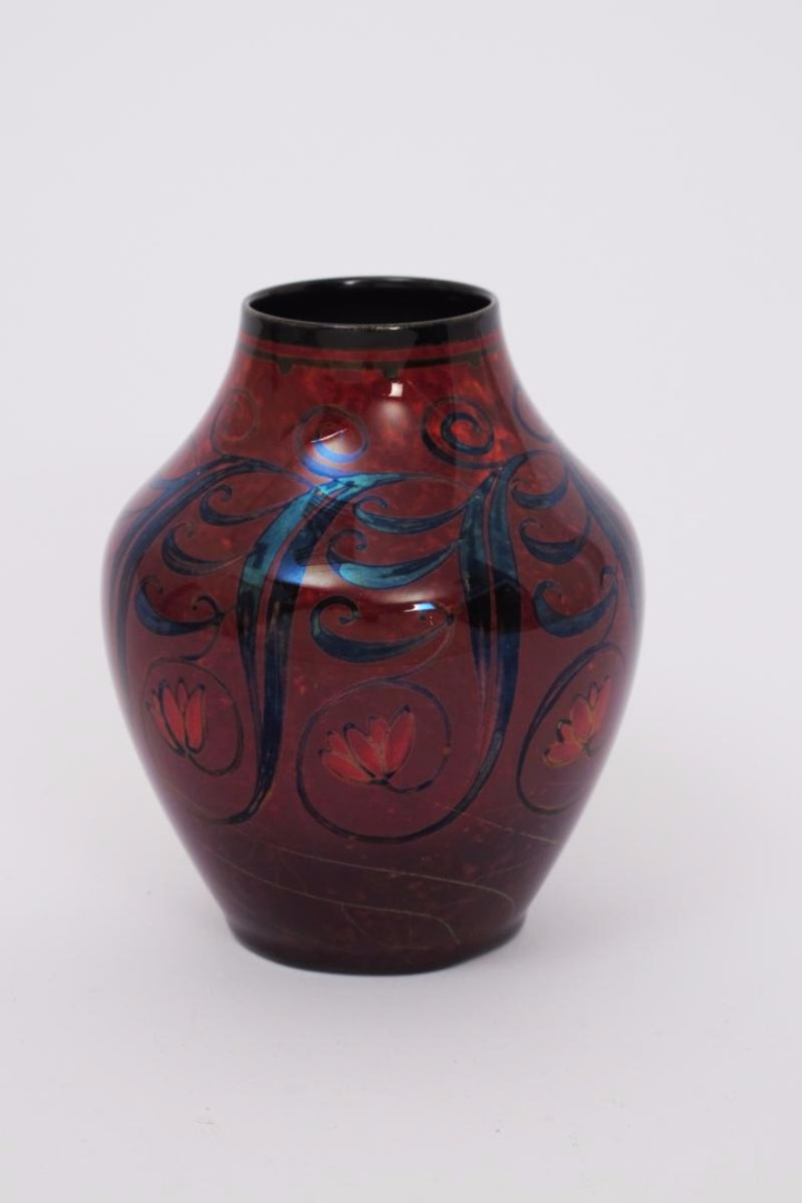 A Pilkington's Royal Lancastrian vase by William S Mycock, dated 1929, ovoid form painted with scrolling flowers and foliage in red and golden lustre on a mottled red lustre ground impressed mark, painted artist cipher and date code, professional restoration to top rim, 13.5cm. high