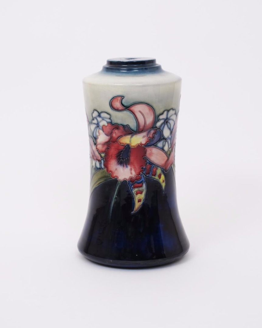 'Frilled and Slipper Orchids' a Moorcroft Pottery lamp base designed by William Moorcroft, waisted cylindrical form, painted in colours on a graduated blue ground impressed marks, painted signature and paper label 28cm. high