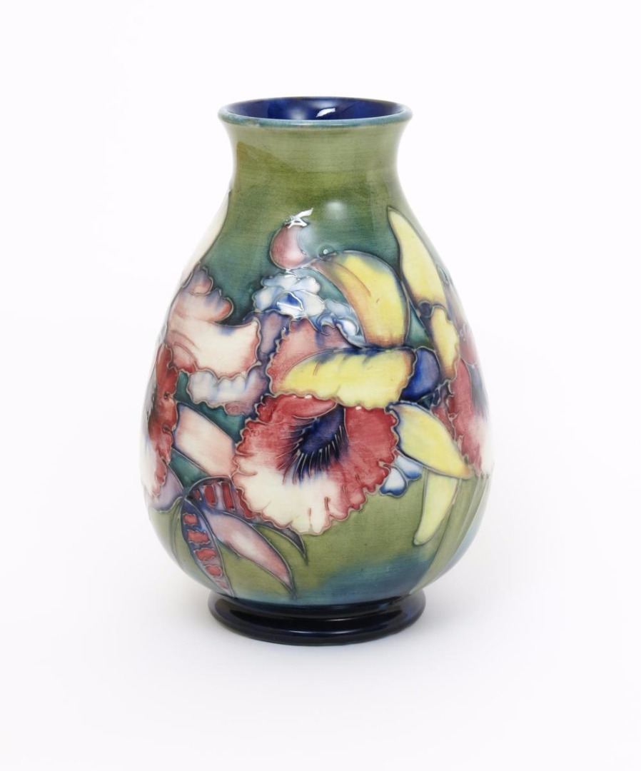 'Frilled Orchid and Springflowers' a Moorcroft Pottery vase, painted in colours on a green ground, impressed marks, painted green signature 24.5cm. high