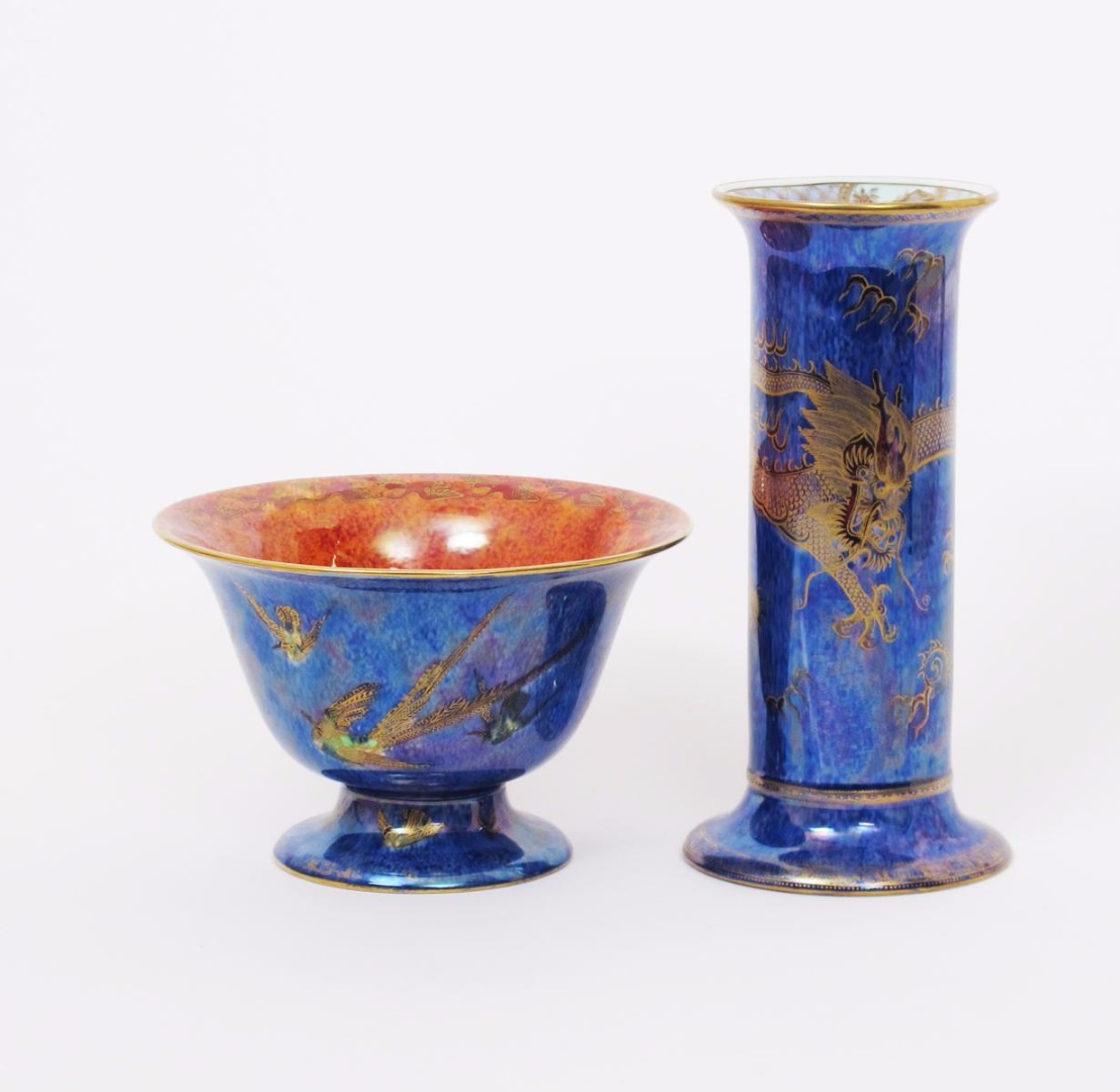 A Wedgwood Dragon lustre vase designed by Daisy Makeig-Jones, shape no.3177, cylindrical form with flaring foot and top rim, printed in gilt on a mottled blue lustre ground, and a Wedgwood Hummingbird lustre footed bowl printed factory marks, 28.5cm. high (2).
