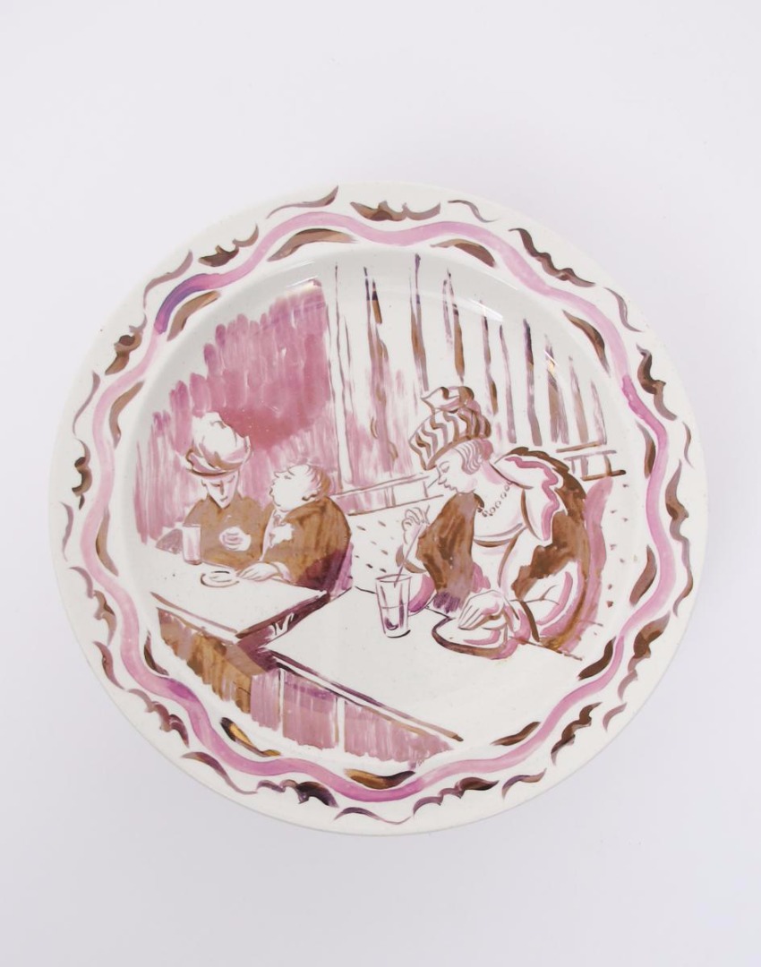 A Wedgwood plate by Therese Lessore, painted with a woman and a couple drinking at tables in a bar, in pink lustre on a white ground impressed mark, painted artist monogram 23cm. diam.