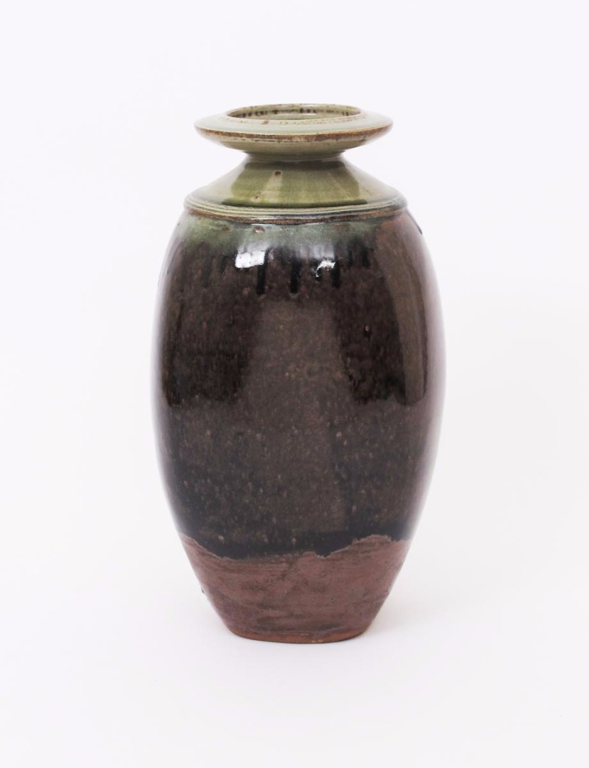 a tall, shouldered cut-sided stoneware vase covered to the foot in a tenmoku glaze, the shoulder and rim with a running celadon glaze unsigned 39cm. high