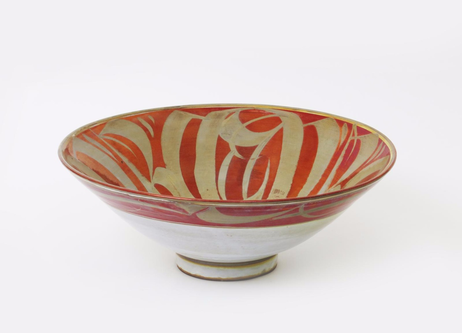 a large Aldermaston Pottery tin glaze earthenware bowl, dated 1993, painted to the interior with brushed design in ruby, gold and silver lustre, on a tin glaze painted artist cipher, date mark 45cm. diam.