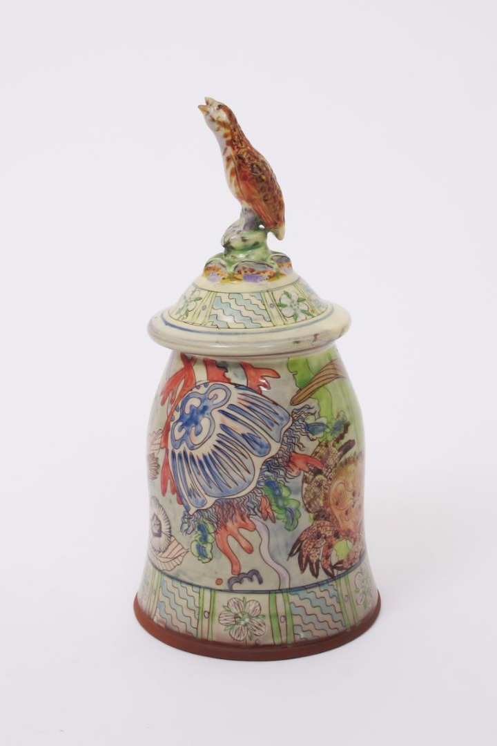 an earthenware lidded vessel, painted with an otter, jellyfish and crab, painted in colours, the cover modelled with a partridge finial impressed seal mark, 26cm. high
