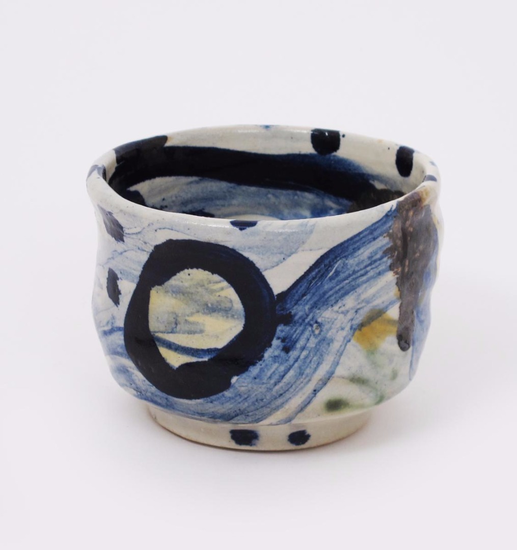 a pottery unomi, painted with simple blue brush design over white with manganese splashes, a plaque by Alex Leckie and a raku plate by David Cohen painted monogram, unomi 8.5cm. high (3)