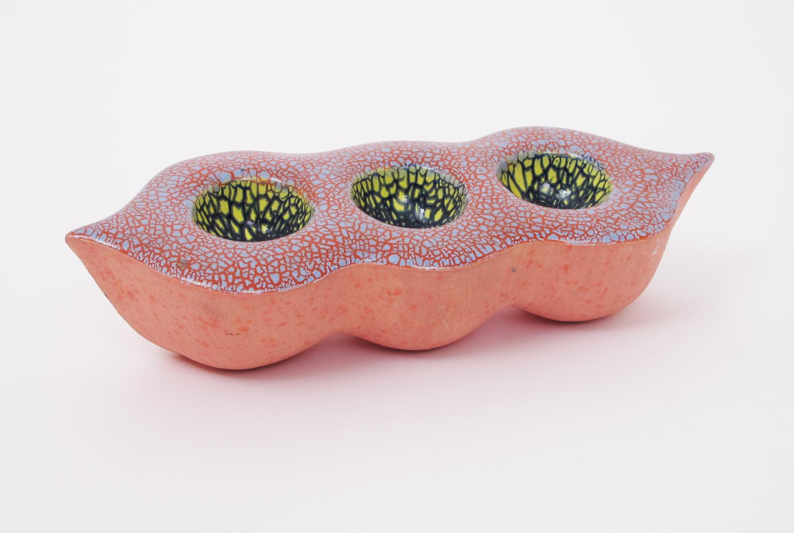 Medium Sliced Triple Peapod, 2000, glazed in shades of pink, yellow and blue, unsigned 27cm. wide