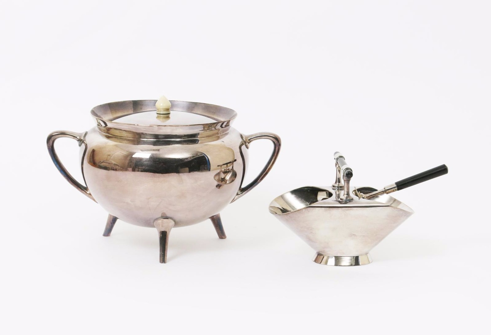 λ A Walker & Hall electroplated sugar basin and shovel designed by Dr Christopher Dresser, model no.119, the shovel with ebonised wood handle, and an electroplated tureen and cover with ivory finial in the manner of Dr Christopher Dresser stamped marks, basin 16.5cm. wide (2).