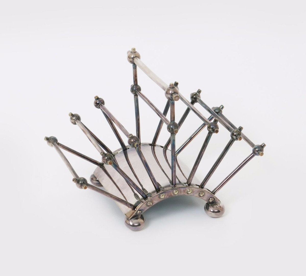 A Hukin & Heath electroplated letter rack designed by Dr Christopher Dresser, model no. 2555, the arched support on four bun feet with articulated rod and ball dividers and central handle, stamped marks, 12.5cm. high