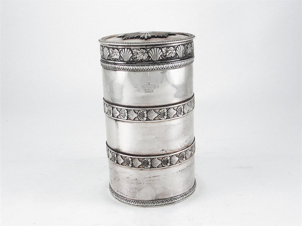 Irish flatware: four fiddle tablespoons, by Carden Terry & Jane Williams of Cork (Dublin hallmarks for 1819), a set of eight fiddle tableforks by James Scott, Dublin 1819, a set of five fiddle rattail dessert spoons by P. Moore, Dublin 1819, a set of six fiddle forks by Arthur Murphy, Dublin 1809, two other dessert forks by S. Neville, Dublin 1812 and a set of six fiddle rattail teaspoons by James Scott, Dublin 1819, all crested, 49oz. (31)