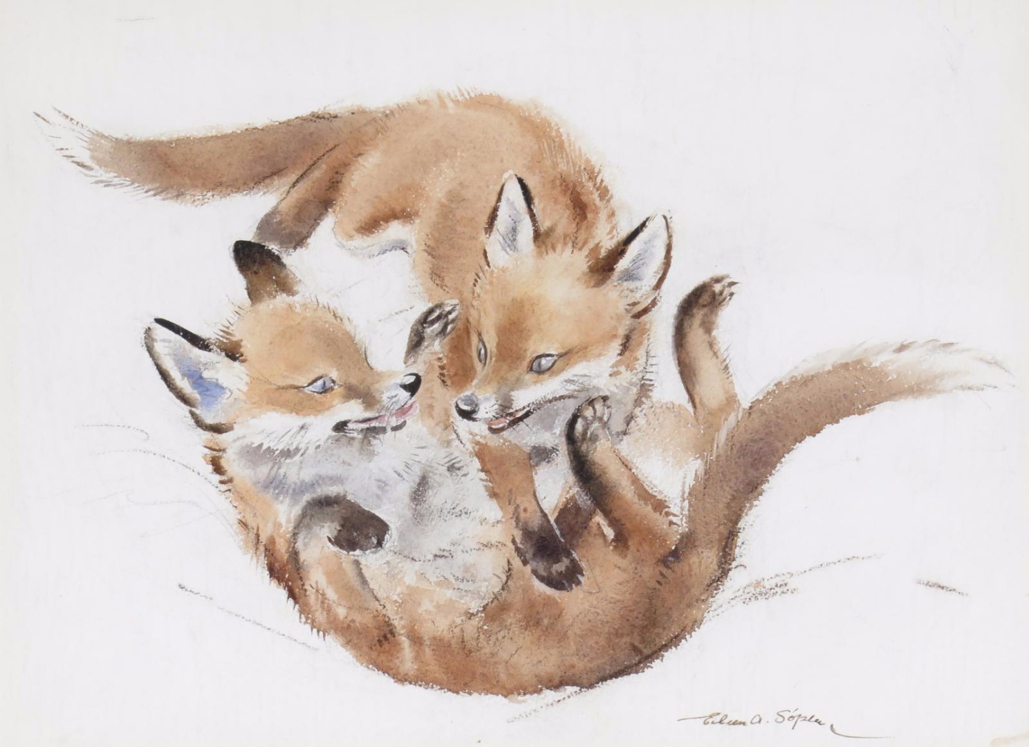 ‡Eileen Alice Soper (1905-1990) Fox Cubs playing Signed Watercolour 27 x 36.5cm
