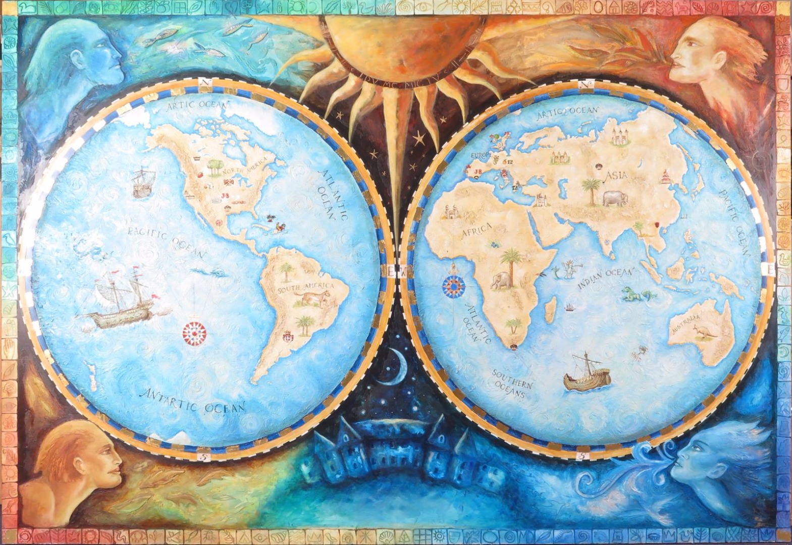 English School 20th Century World map with distilleries and other notations Mixed media on panel...