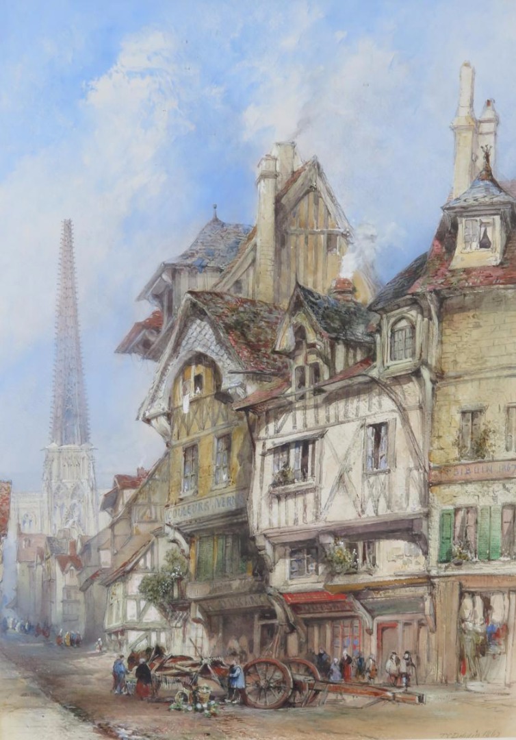 Thomas Colman Dibdin (1810-1893) Market produce falling from a cart by a cathedral; Figures by a...