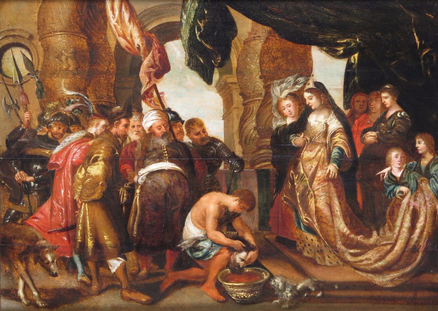 After Peter Paul Rubens Queen Tomyris and the head of Cyrus Oil on panel 52 x 71.56cm; 21½ x...