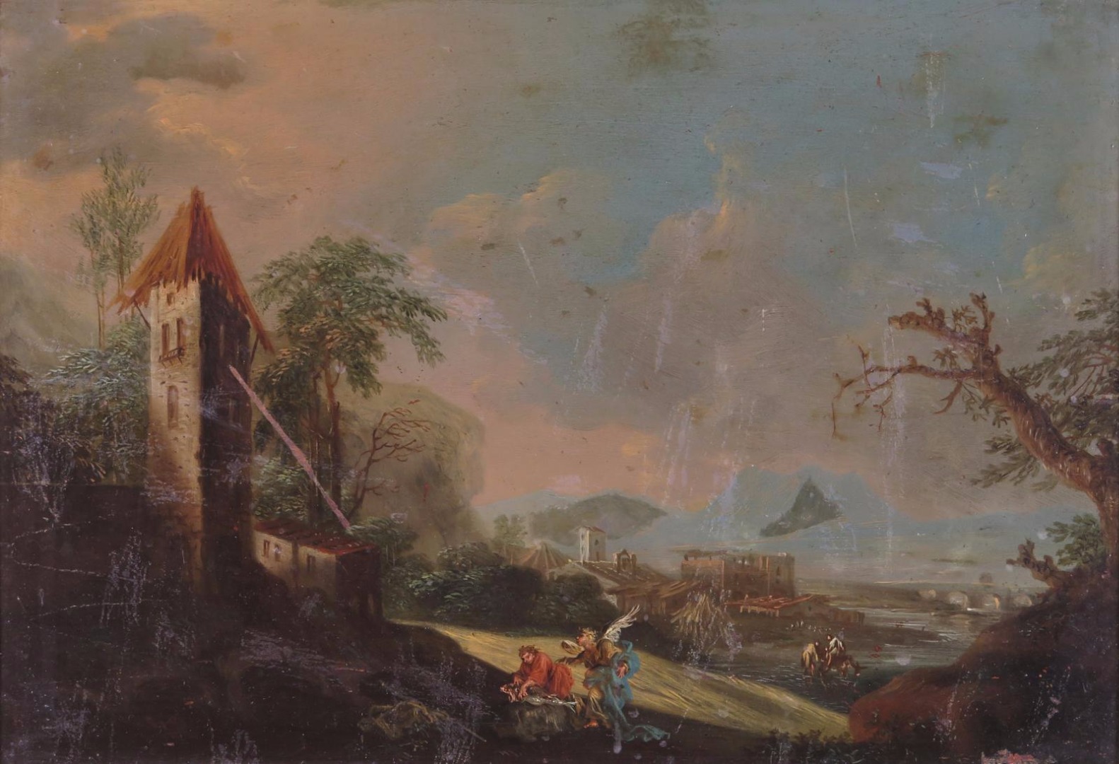 Dutch School 18th Century Harvesters by a windmill; Tobias and the angel Two