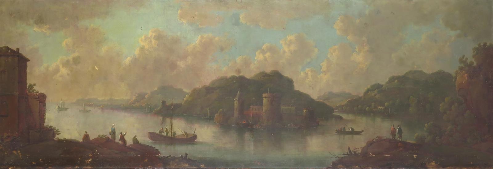 Follower of Guiseppe Zais A castle on a bend in the river with a ferry boat Oil on canvas
