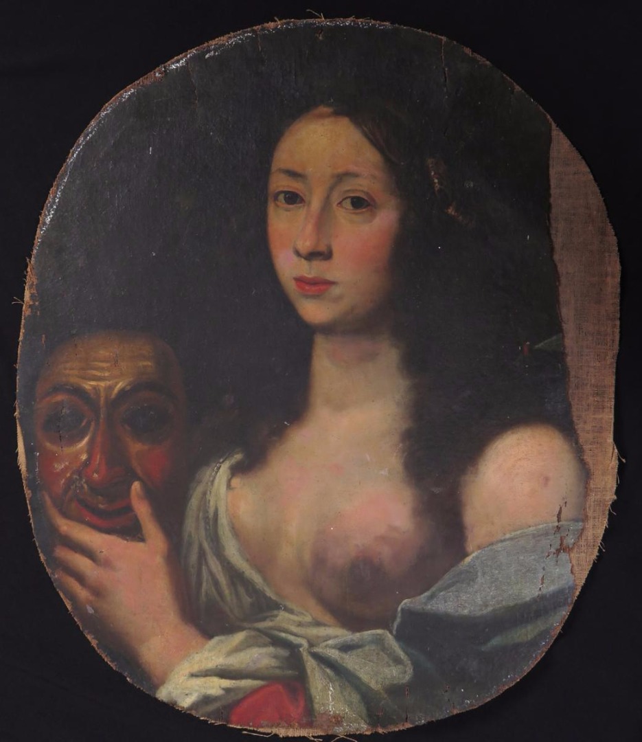 English School 18th Century Portrait of an actress holding a mask Oil on canvas