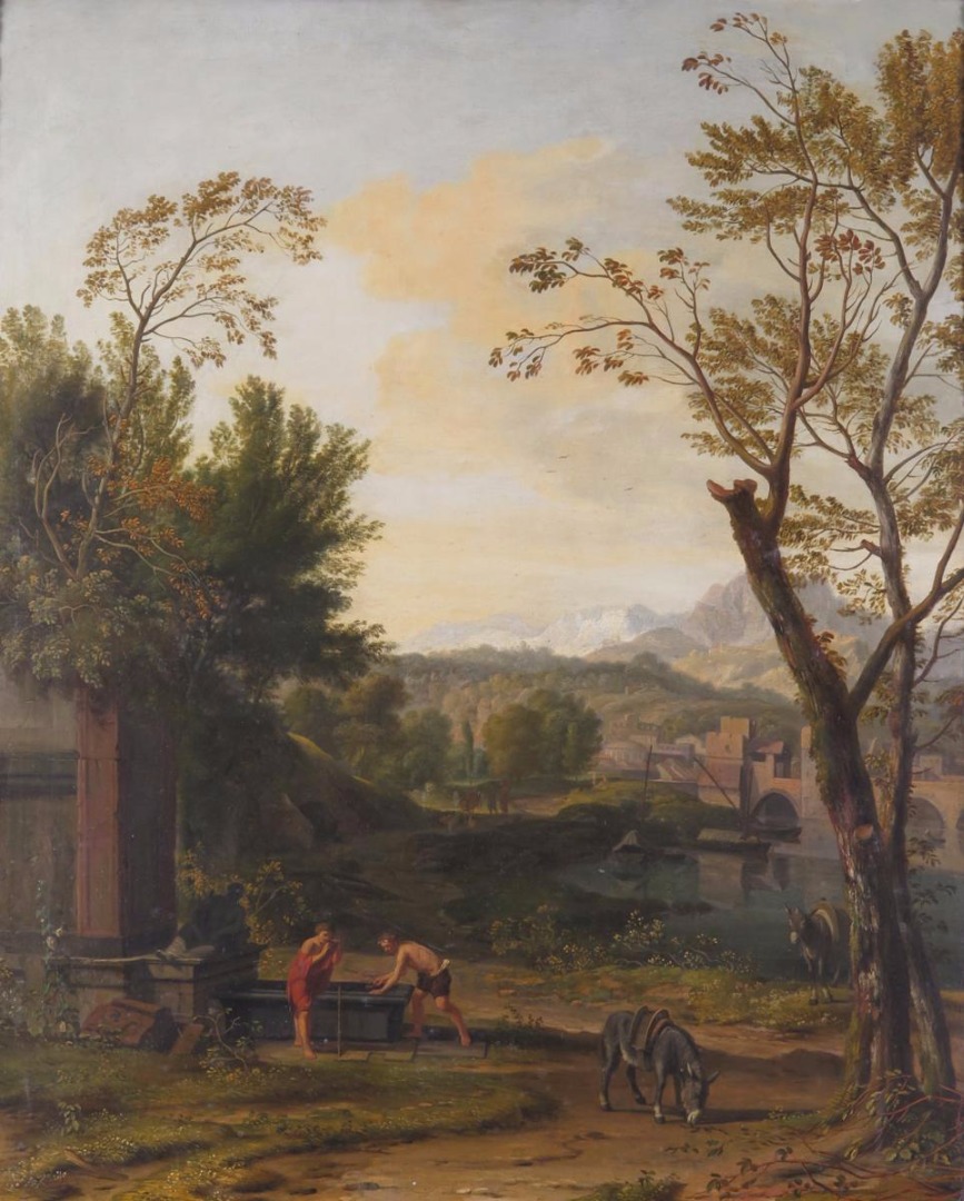 Jean Francisque Millet the Younger (French 1666-1723) Figures pausing for water in an Italianate...