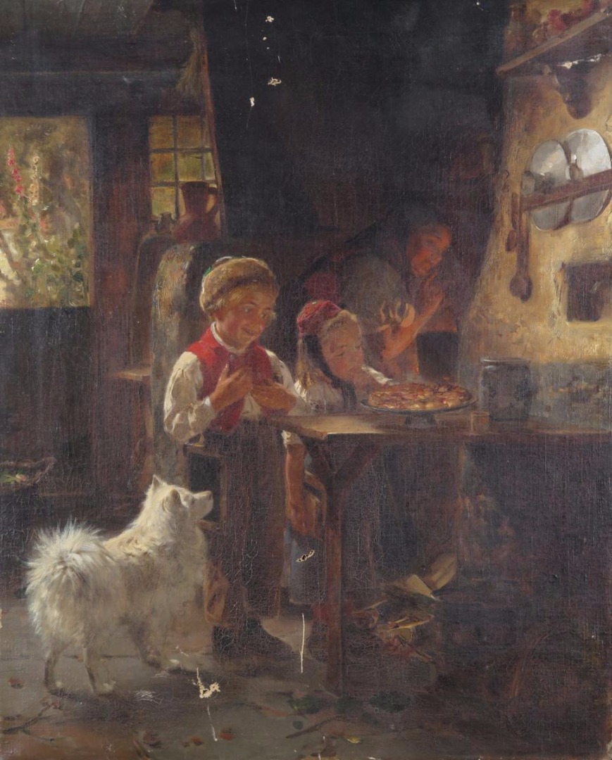 Russian School 19th Century A woman baking tarts with her children and Samoyed dog Signed...