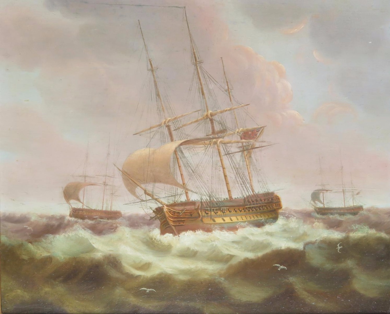 Attributed to Thomas Luny (1759-1837) Ships in a swell Signed and dated 182* Oil on panel 27 x...