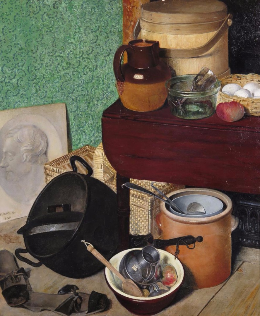 Thomas Fowke (1827-c.1887) Still life of pots and pans with sandals and a bust relief Signed and...