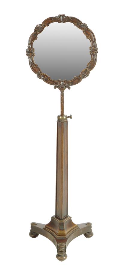 λ An early Victorian Irish rosewood shaving/wig mirror, the scroll and shell carved frame above an adjustable stem and triform base, 163.7cm high (extended), 37.5cm wide.