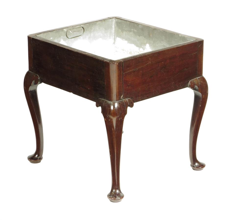 A mahogany jardiniƩre, with a lift-out metal liner on cabriole legs and pad feet, possibly 18th century, Irish, 47cm high, 48cm wide, 43cm deep.