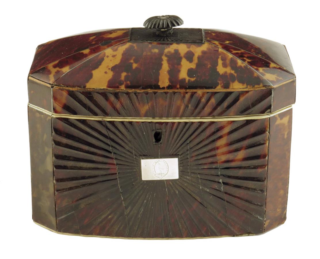 A Regency tortoiseshell tea caddy, inlaid with pewter stringing and with ivory edging, with a moulded fan front and a silver plaque engraved with the Digby family garter, with an ostrich and the motto 'A DEO NON FORTUNA', with a divided interior lacking its lids. 15.2cm high, 19.1cm wide.