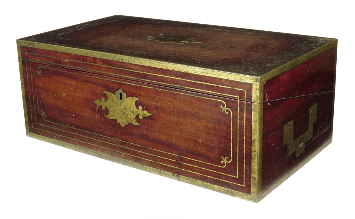 A George IV mahogany and brass mounted writing slope by G.C. Diller, the hinged lid with a shaped plaque inscribed 'Chris Edwd Lefroy', the interior with a baize lined writing slope with gilt brass candle sconces and a pen tray above secret drawers, two with apertures for guineas, with a printed paper label inscribed 'G.C. DILLER, Cabinet, Portable Writing-Desk, & Copying Machine Maker, No. 5, CHANDOS STREET, COVENT GARDEN. Tea Chest, Dressing and Jewellery Boxes, made to any Pattern, on the shortest Notice', with sunken brass side carrying handles, 20.5cm high, 53.3cm wide, 29.7cm deep.