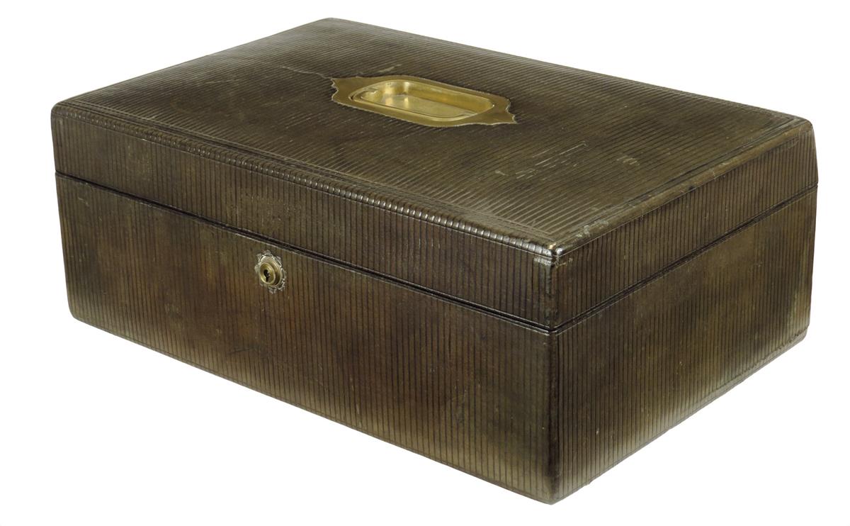 A Victorian green leather writing slope by Farthing & Thornhill, the hinged lid with a sunken brass handle revealing a tooled leather slope stamped 'FARTHING & THORNHILL MAKERS 42 CORNHILL', with a lift-out tray fitted with a glass inkwell with compartments and with various utensils including: a pair of scissors, a button hook and a penknife with a brass Bramah lock, 16.3cm high, 40.8cm wide, 28cm deep.