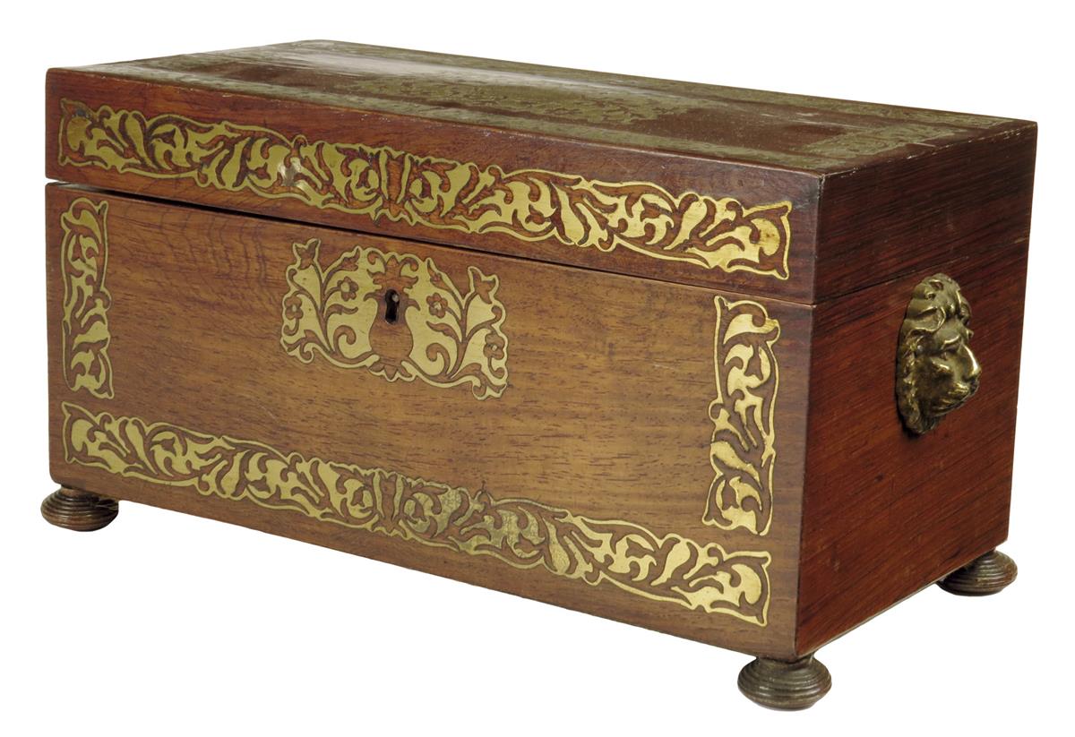 λ A George IV rosewood and brass marquetry tea chest, the interior with a pair of lidded pull-out canisters flanking a sugar bowl aperture, the sides with lion's masks, 16.6cm high, 32cm wide.