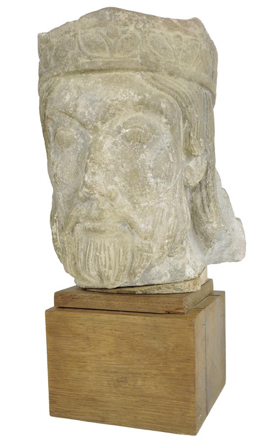 A French Romanesque style carved stone bust of a king, probably early 19th century, 21.5cm high, mounted on a later wood plinth.