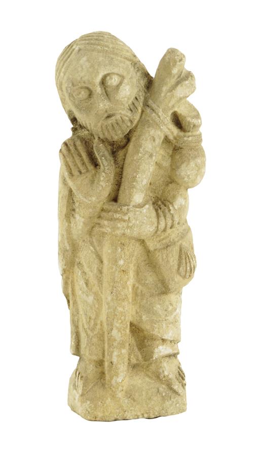 A Romanesque style carved stone figure of a pilgrim, 14cm high.