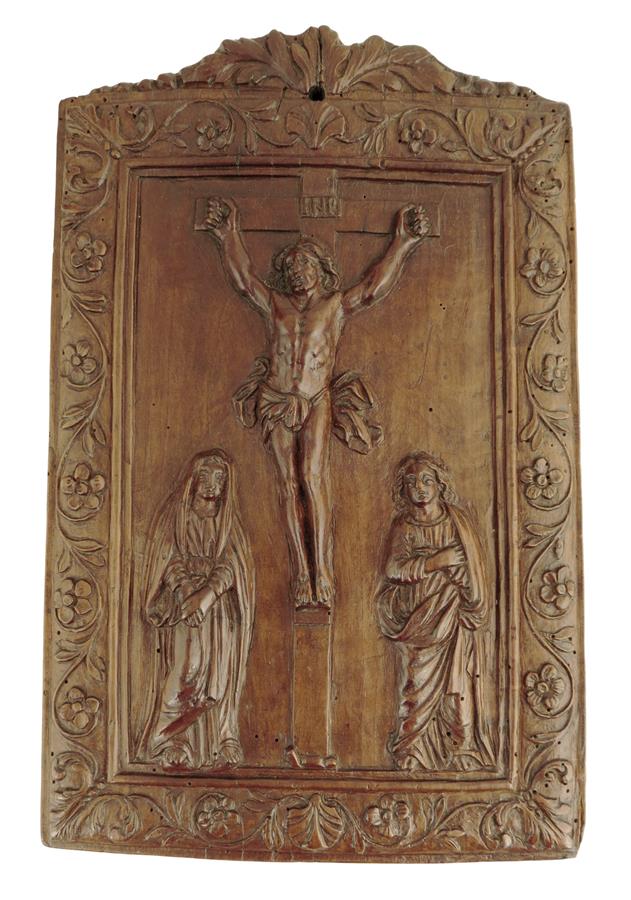 A carved walnut devotional plaque, depicting the Crucifixion with attendant figures of the Virgin Mary and St. John, within a carved leaf and flower border, late 17th century, possibly French, 27.7 x 17.8cm.