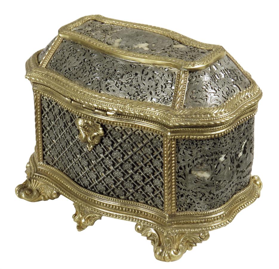 A 19th century French gilt brass and pewter jewellery casket, of serpentine form with pierced panels with scrolling leaves and flowers with figures on horseback and three figures with a dog, with a silk lined interior, 13.8cm high, 19cm wide.