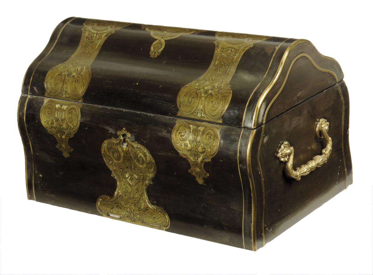 λ A 19th century French ebonized and brass inlaid jewellery box, the serpentine domed lid inlaid with engraved sprapwork panels with white tortoiseshell borders, with cast side carrying handles and a vacant silk lined interior, 16.8cm high, 28.5cm wide.