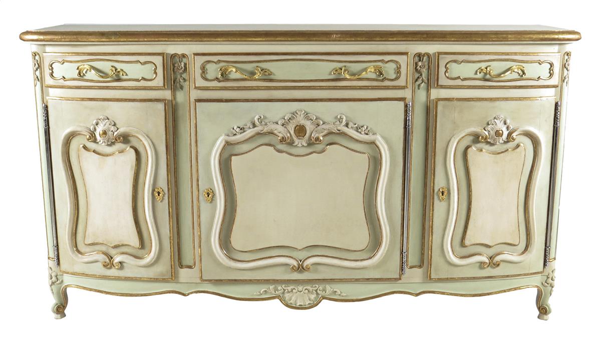 A French provincial painted oak buffet, with parcel gilt decoration with three frieze drawers above cupboards, 105cm high, 189cm wide, 54.2cm deep.
