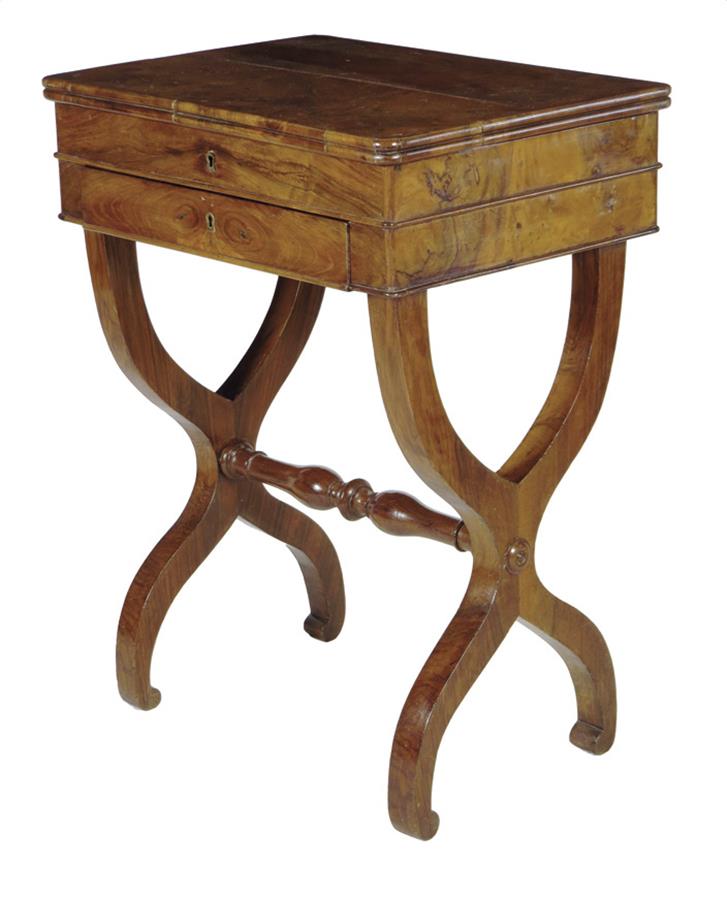 A Louis Philippe walnut lady's work table, the divided interior with a pair of lidded compartments and a mirror, the frieze drawer fitted with a leather lined writing surface and a pen compartment, on 'X' shape supports united by a turned stretcher, 76.5cm high, 56.8cm wide, 42cm deep.