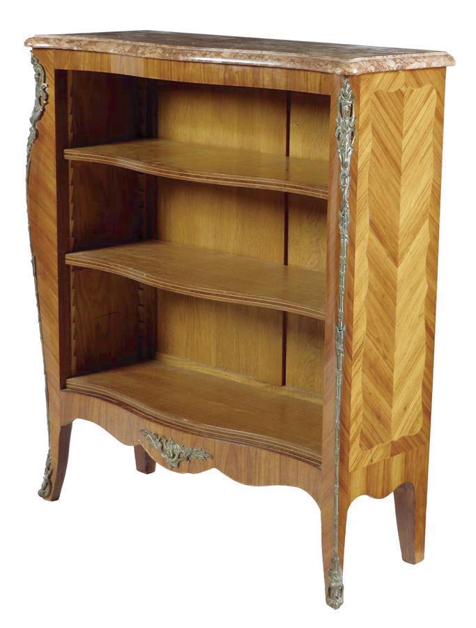 A French kingwood serpentine open bookcase, the red Breccia moulded edge marble top, above three adjustable shelves, with gilt brass mounts, 100.5cm high, 87.5cm wide, 32.5cm deep.