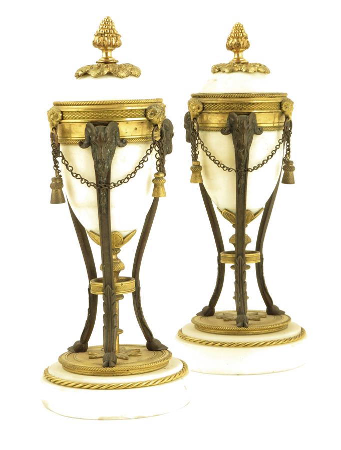 A pair of Louis XVI marble and bronze cassolettes, gilt and patinated in the form of atheniennes, the reversible tops with bud finials on ram's head monopodia supports and hung with tasselled chains, 19th century, 24.5cm high. (2)