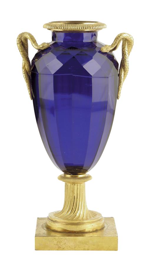 A 19th century French ormolu and cobalt blue glass vase in Louis XVI style, with a ribbed rim, the cut body with entwined serpent handles, on a fluted foot and a square plinth, 25.7cm high.