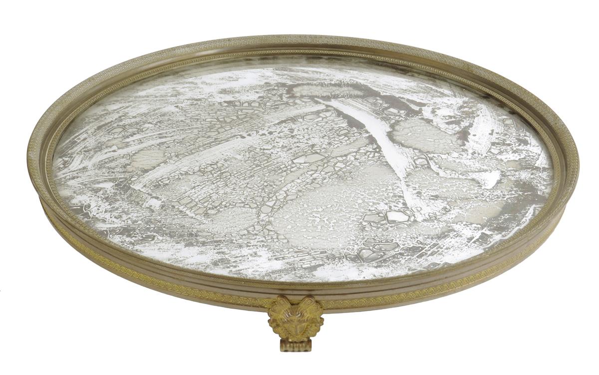 A late 19th century French surtout de table, the circular mirrored top within moulded borders, on classical female mask feet, 39cm diameter.