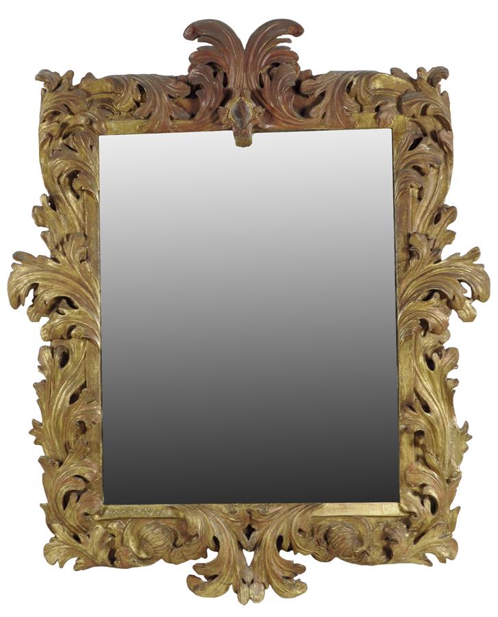 A large 18th century Italian carved giltwood wall mirror, the later rectangular bevelled plate within a scrolling leaf frame, the top carved with a cartouche with a coat of arms, 169.5 x 143.5cm.