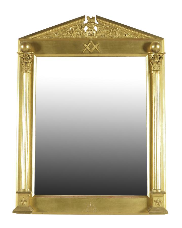 A Victorian giltwood and gesso Masonic wall mirror, the rectangular plate flanked by Corinthian columns with orb finials, the frieze with a square and compass, the broken arch pediment decorated with scrolling leaves and the Royal Crest and motto 'DIEU ET MON DROIT', 75.8 x 56.3cm.